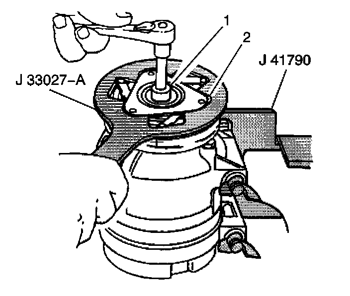 2. Clamp the A/C compressor holding fixture, J 41790 in a vise and attach the A/C compressor to the J 41790.