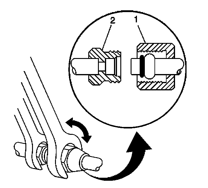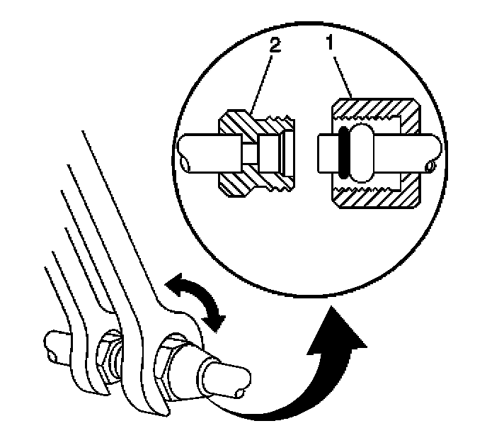 9. Using a back-up wrench on the condenser fitting (2), secure the compressor hose fitting (1) to the condenser.