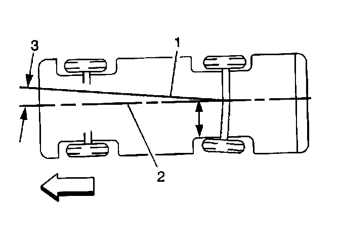 In the illustration, toe-in is shown on the left rear wheel, moving the thrust line (1) off center. The resulting deviation from the centerline is the thrust angle.