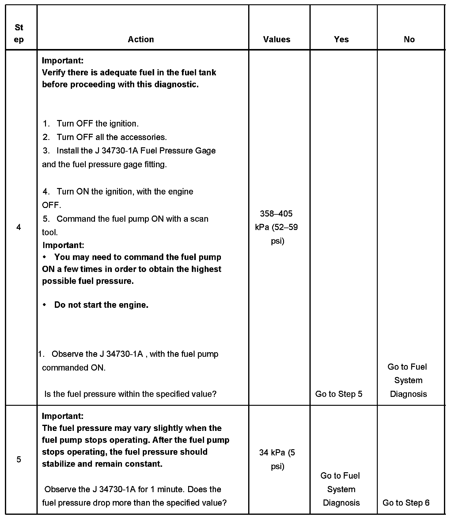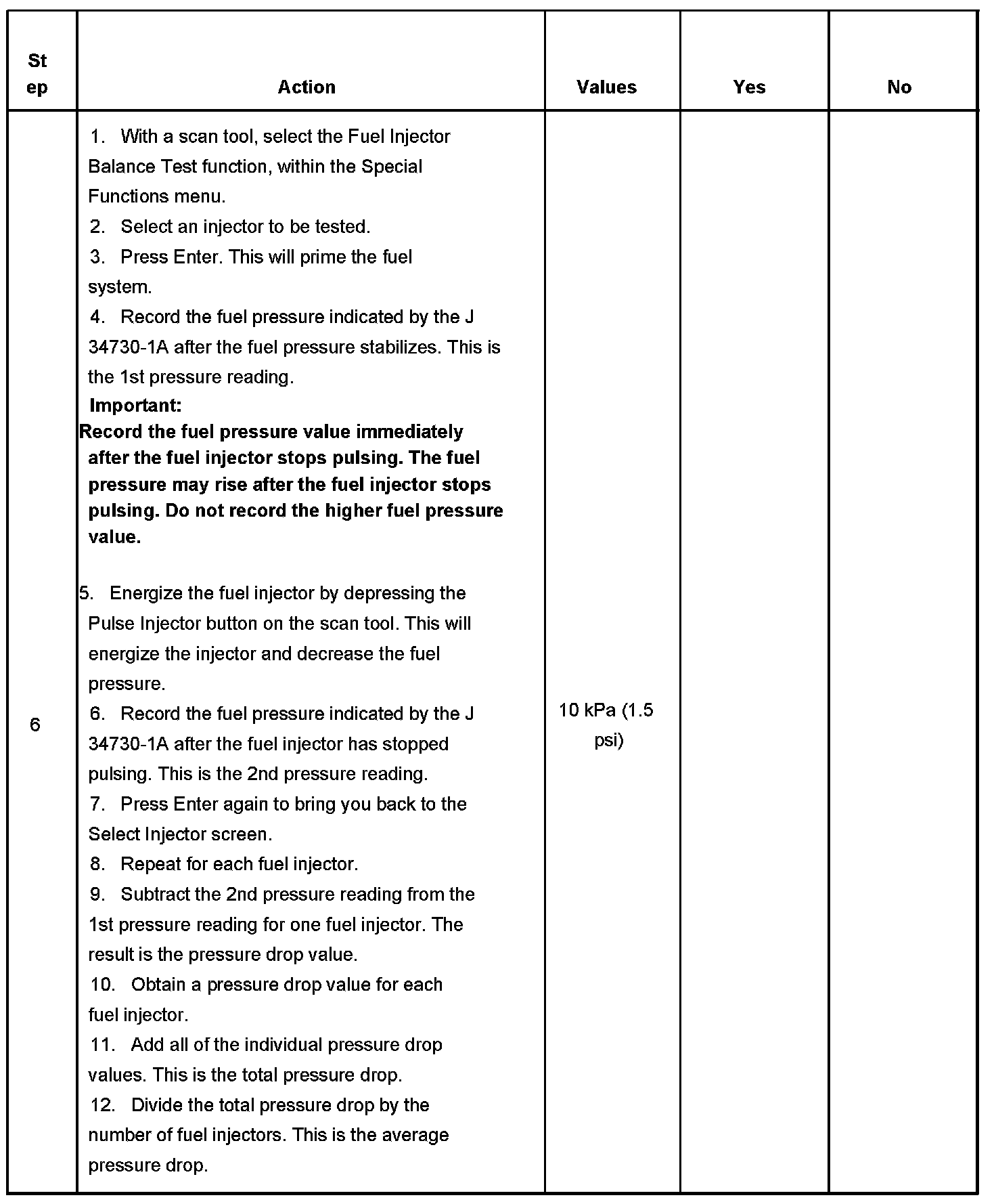 6. If the pressure drop value for each fuel injector is within 10 kPa (1.5 psi) of the average pressure drop value, the fuel injectors are flowing properly.