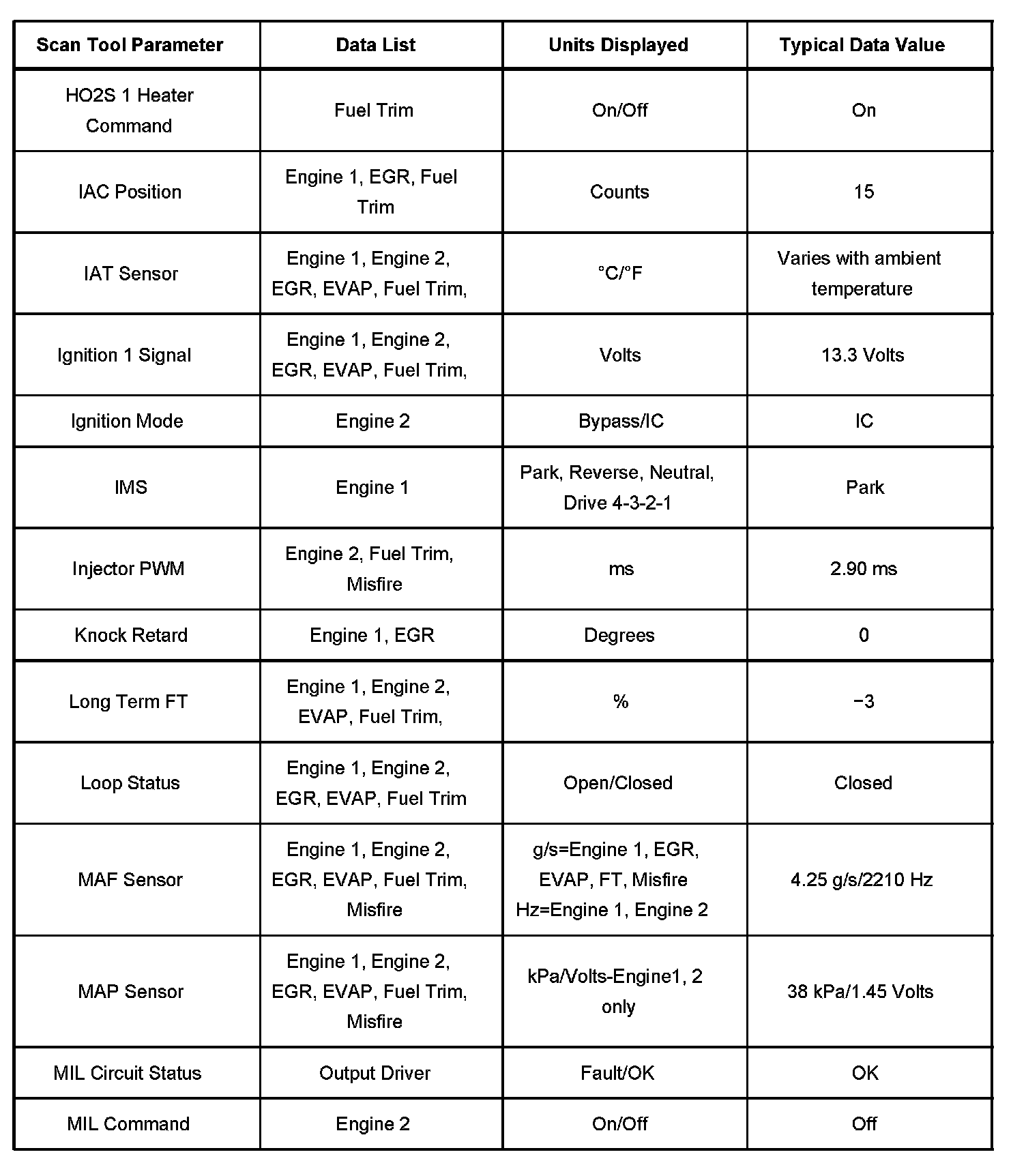 - Engine Data 2-Contains general information regarding engine coolant temperature (ECT), intake air temperature (IAT), mass air flow (MAF), manifold absolute pressure (MAP), and other basic engine operating conditions.
