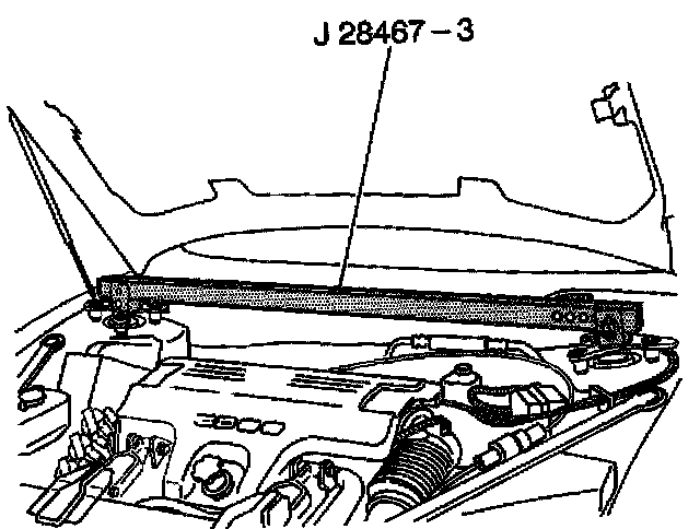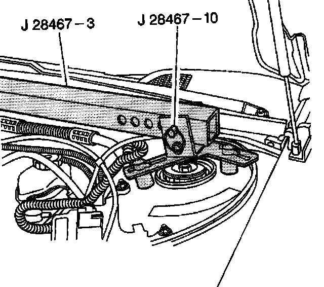 10. Install the radiator shelf tube J 28467-2A on the top of the strut tower tube J 28467-3 on the driver side.