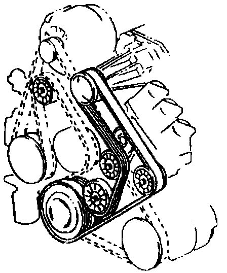 All driven accessories rigidly mount to the engine. Spring-loaded belt tensioners maintain the drive belt tension. Each drive belt has its own tensioner. A drive belt squeak, occurring when the engine starts or stops, is normal and has no effect on the durability of the drive belt. The drive belt tensioner can control the drive belt tension over a broad range of drive belt lengths, due to stretching. However, there are limits to the tensioner's compensation ability. Poor tension control and/or damage to the tensioner may occur after using the tensioner outside of its operating range. Replace the drive belt when this occurs.