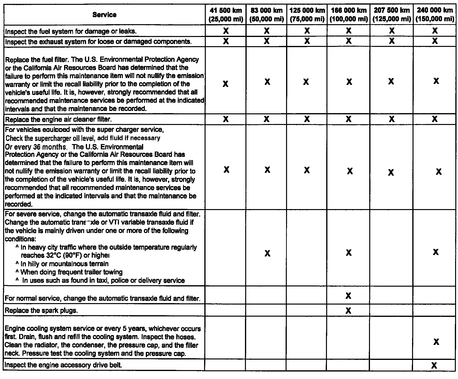 (Maintenance I or Maintenance II) after the indicated kilometers (miles) shown for each item.