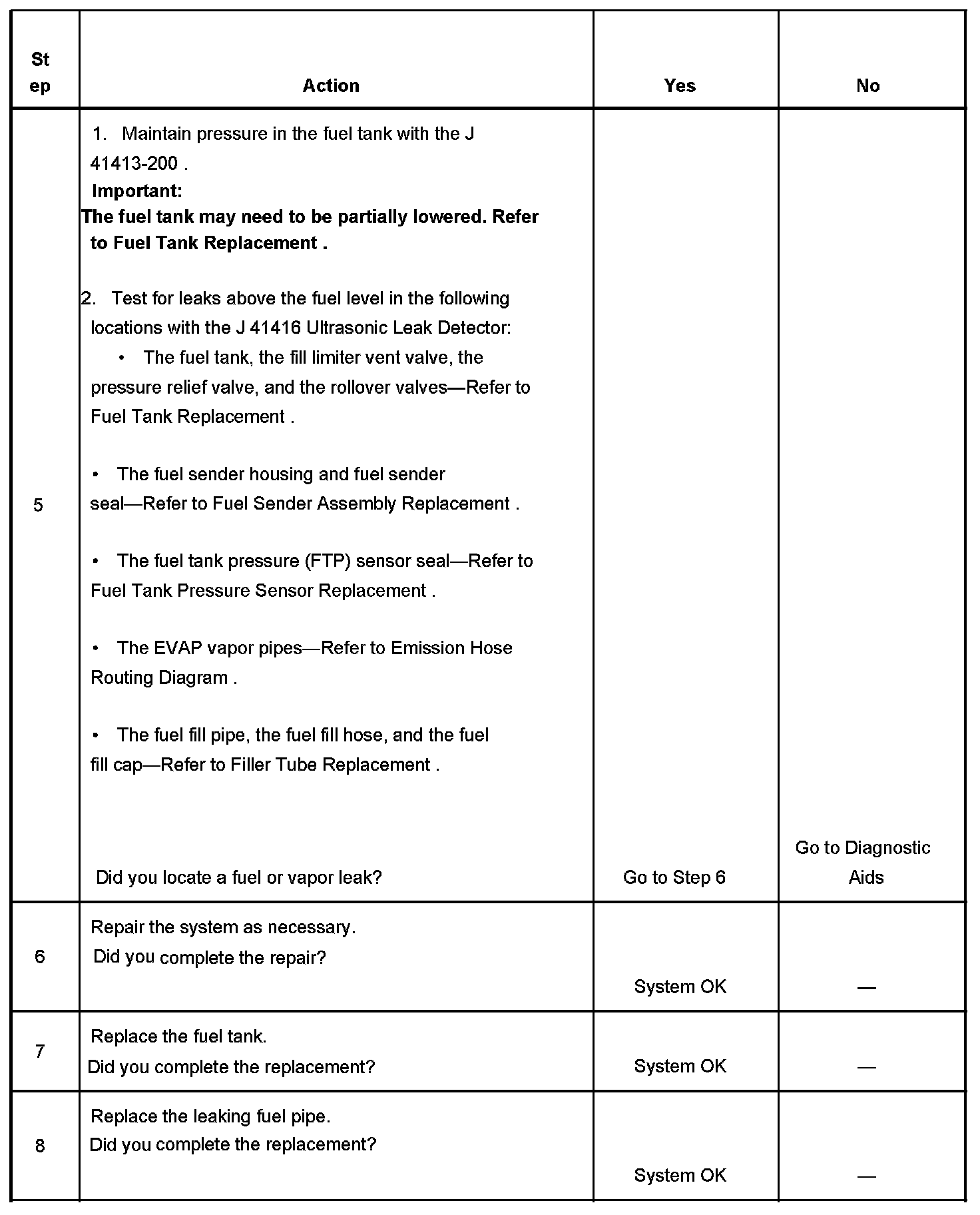 The fuel tank leak test is used to locate any fuel or fuel vapor escaping the fuel tank area. Fuel vapors escaping above the fuel level will be detected when the evaporative emission (EVAP) diagnostics complete one test cycle. The malfunction indicator lamp (MIL) will illuminate after the EVAP diagnostics complete two test cycles.