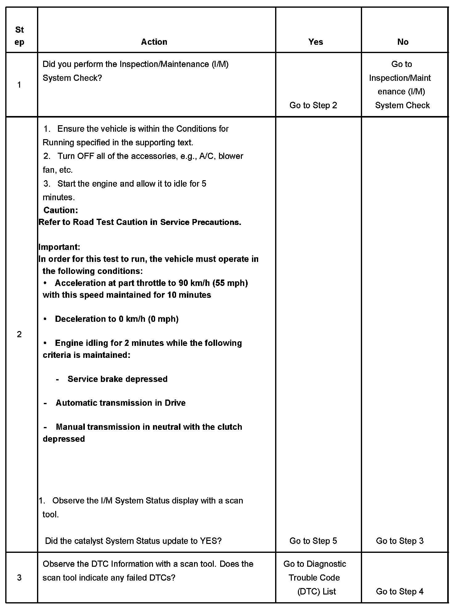 The purpose of this test is to satisfy the enable criteria necessary to execute inspection/maintenance (I/M) readiness diagnostics for the catalyst system. The test may be used to set the I/M System Status indicators to YES. The I/M System Status display on the scan tool provides an indication of whether the control module has completed the required tests. The I/M System Status does not indicate that the tests have passed or failed. When all of the diagnostics for a specific system have run and passed, the I/M System Status will update to YES. If a test for a specific system has failed, the I/M System Status will update to YES, indicating a determination was made even if all of the other tests for that system have not run.