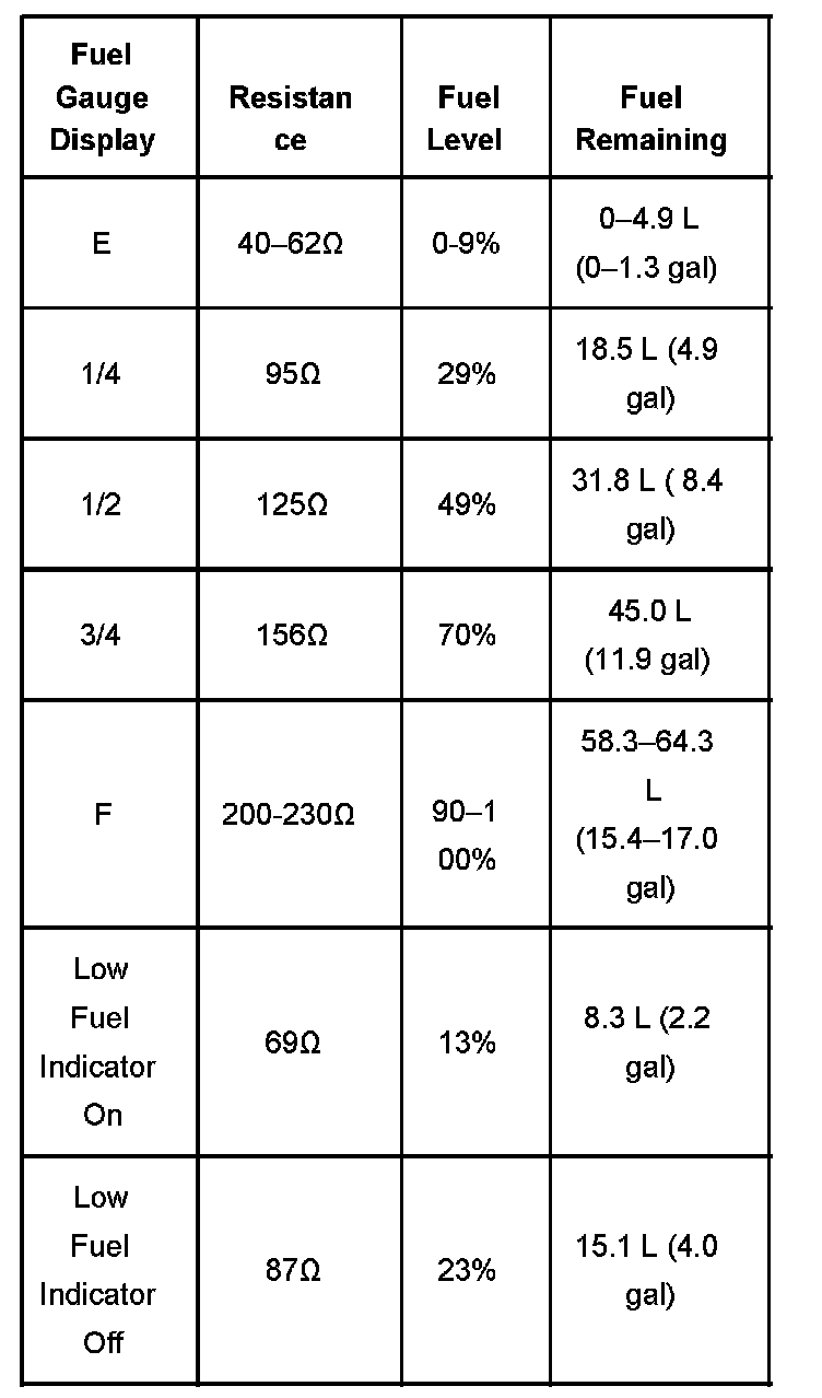 FUEL LEVEL SPECIFICATIONS