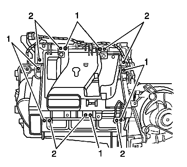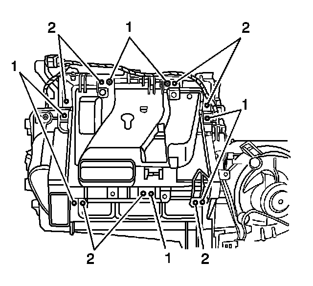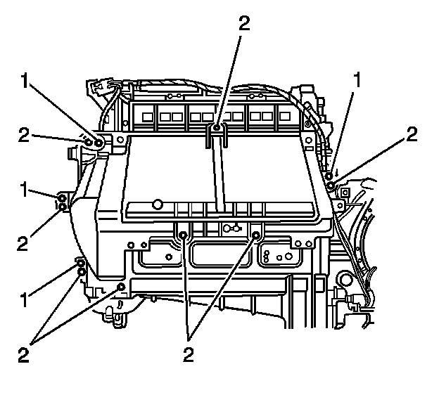 11. Remove the heater core cover heat stakes (1) with a small chisel.