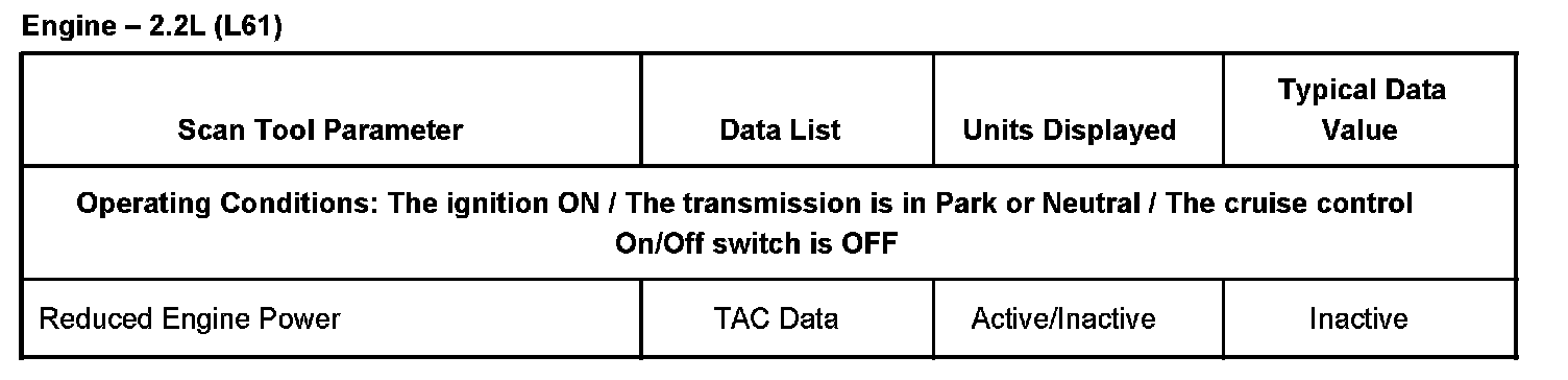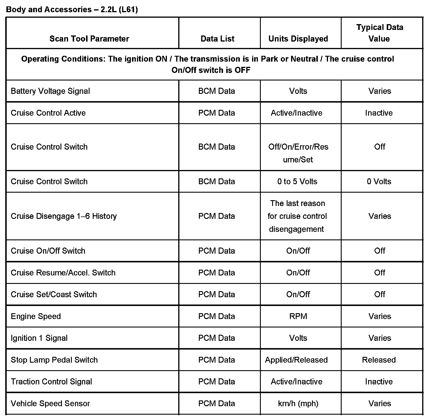 The typical data values are obtained from a properly operating vehicle under the conditions specified in the first row of the scan tool data list table. Comparison of the parameter values from the suspect vehicle with the typical data values may reveal the source of the customer concern.