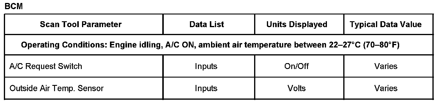 Use the Scan Tool Data Display Values and Definitions in order to assist in diagnosing the HVAC. Compare the vehicles actual scan tool data with the typical data display value table information. Use the data information in order to aid in understanding the nature of the concern when the vehicle does not match with the typical data display values.