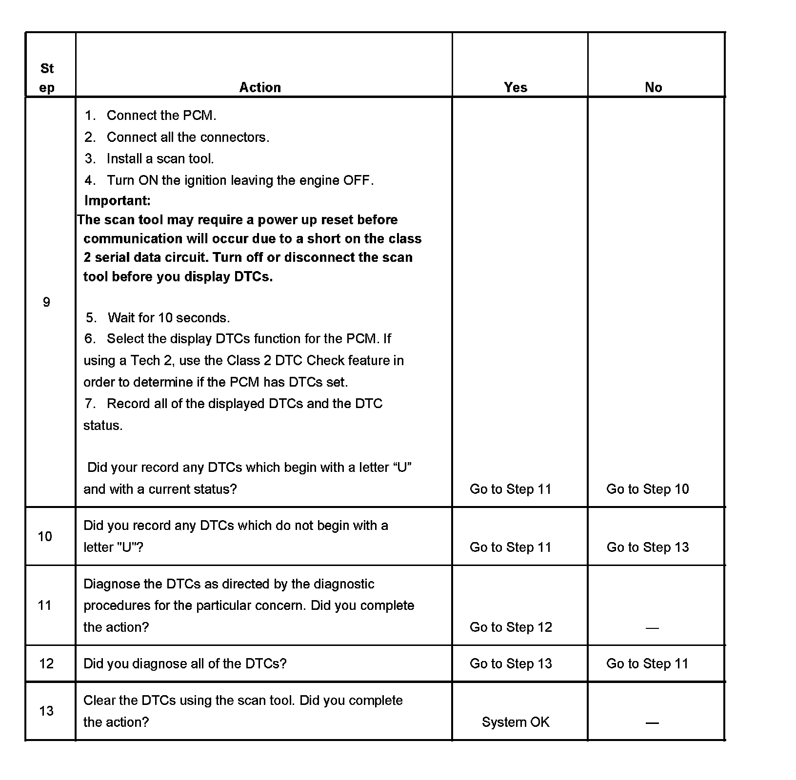 The powertrain control module (PCM) is connected to the class 2 serial data circuit. The class 2 serial data circuit is used for diagnostic purposes only in this vehicle. Connecting a scan tool to the data Link connector (DLC) allows communication with the PCM for diagnostic purposes. DTCs may be set due to this symptom and during this diagnostic procedure. Complete the diagnostic procedure in order to ensure all the DTCs are diagnosed and cleared from memory.