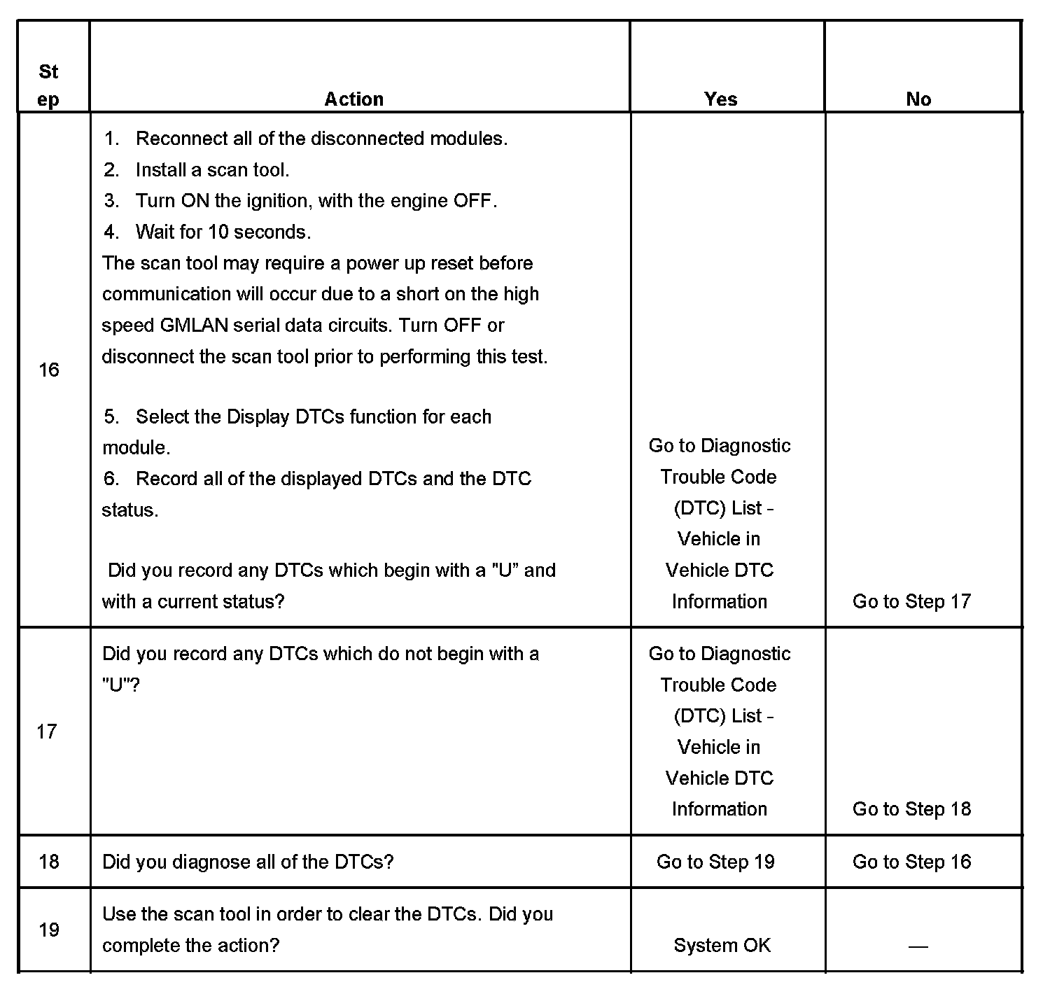 SCAN TOOL DOES NOT COMMUNICATE WITH HIGH SPEED GMLAN DEVICEModules connected to the high speed GMLAN serial data circuits monitor for serial data communications on the high speed GMLAN network during normal vehicle operation. Operating information and commands are exchanged among the modules. When a module detects a bus-off condition a DTC U0001 or U2100 will be set. These DTCs can be retrieved as history only.