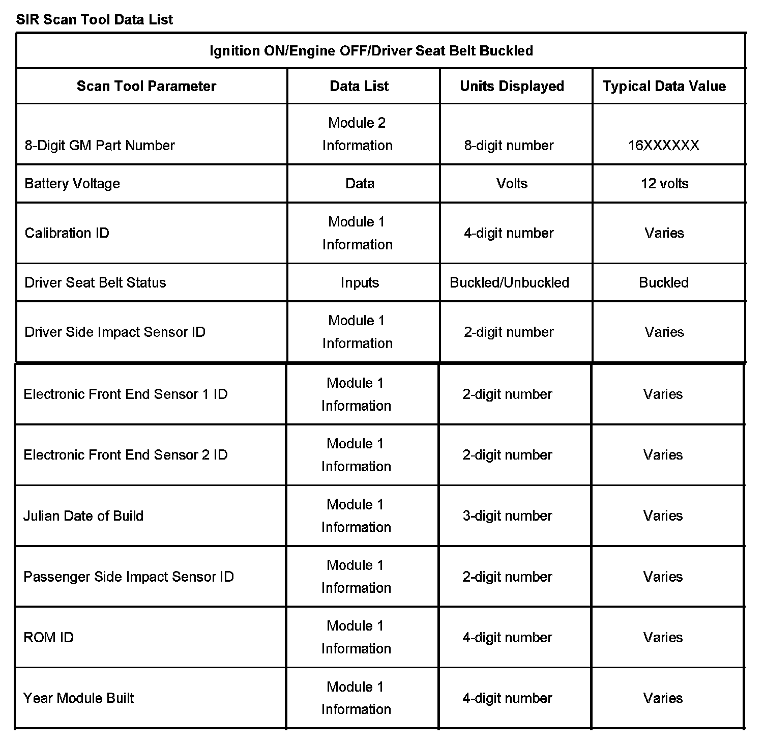 Use the SIR scan tool data list as directed by a diagnostic table or in order to supplement the diagnostic procedures. Begin all of the diagnostic procedures with the Diagnostic System Check - Restraint Systems. Use the SIR Scan Tool Data List after the following is determined: