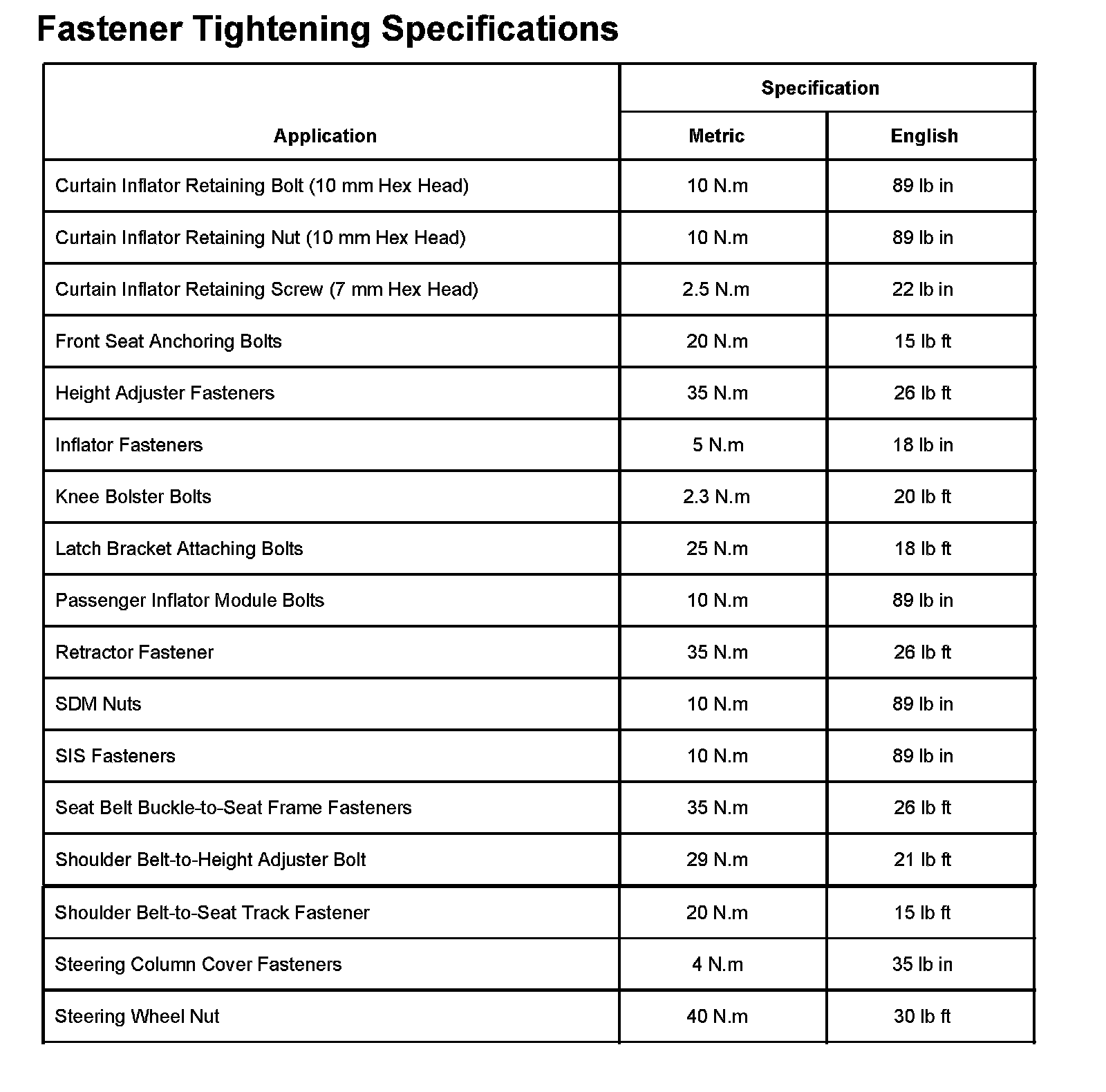 Fastener Tightening Specifications:
