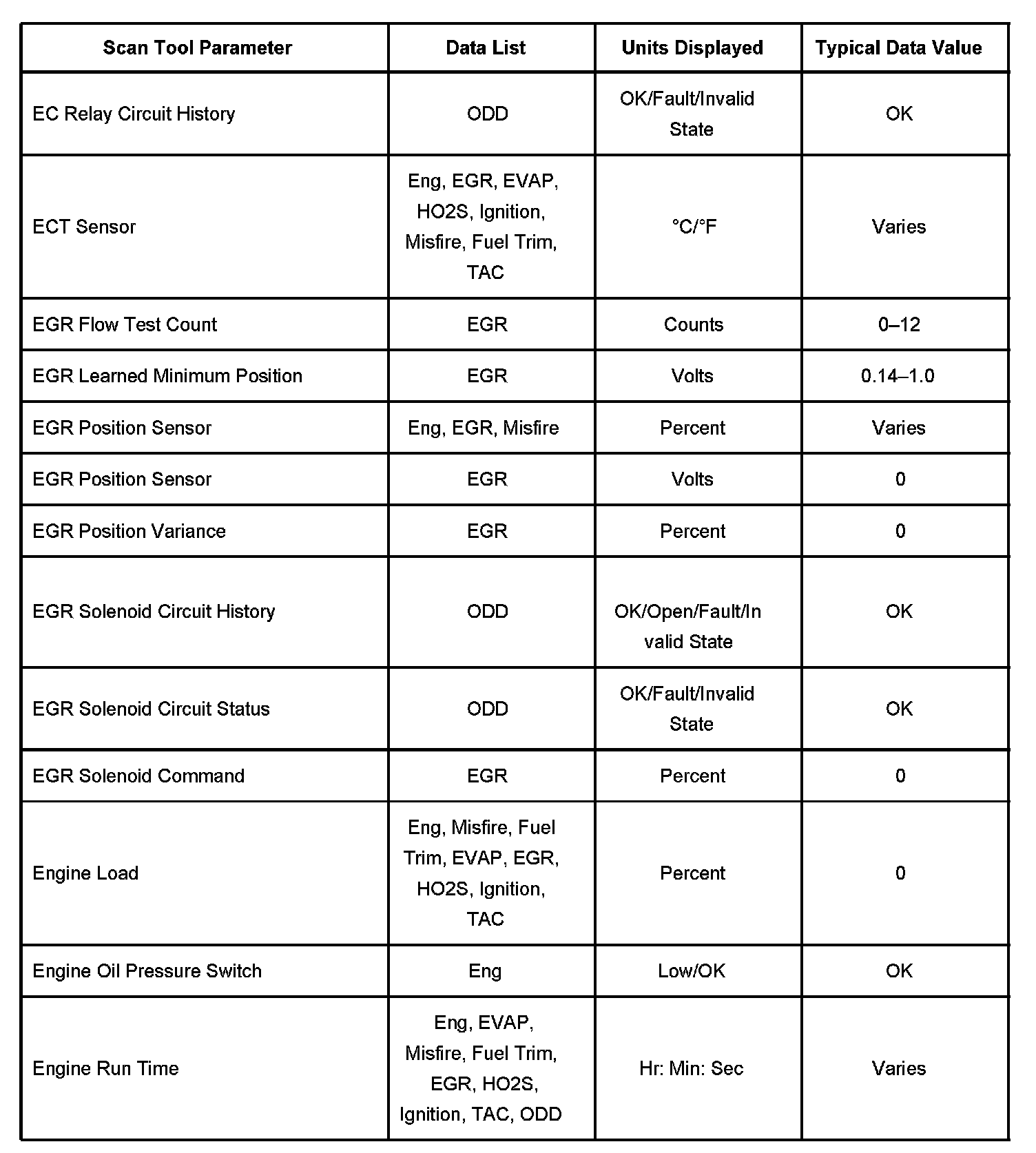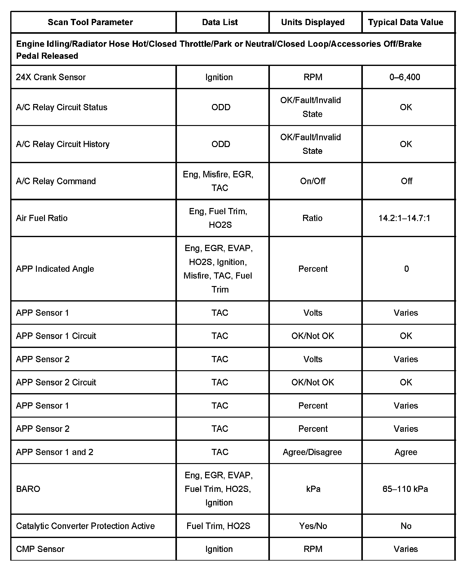 SCAN TOOL DATA LISTThe Engine Scan Tool Data List contains all engine-related parameters that are available on the scan tool. The list is arranged in alphabetical order. A given parameter may appear in any one of the data lists, and in some cases may appear more than once, or in more than one data list in order to group certain related parameters together.