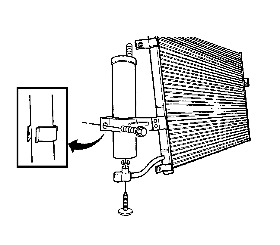 3. Install the receiver-dryer into the band clamp. Support the receiver-dryer-to-condenser pipe while pushing the receiver-dryer downward until the pipe is fully installed.