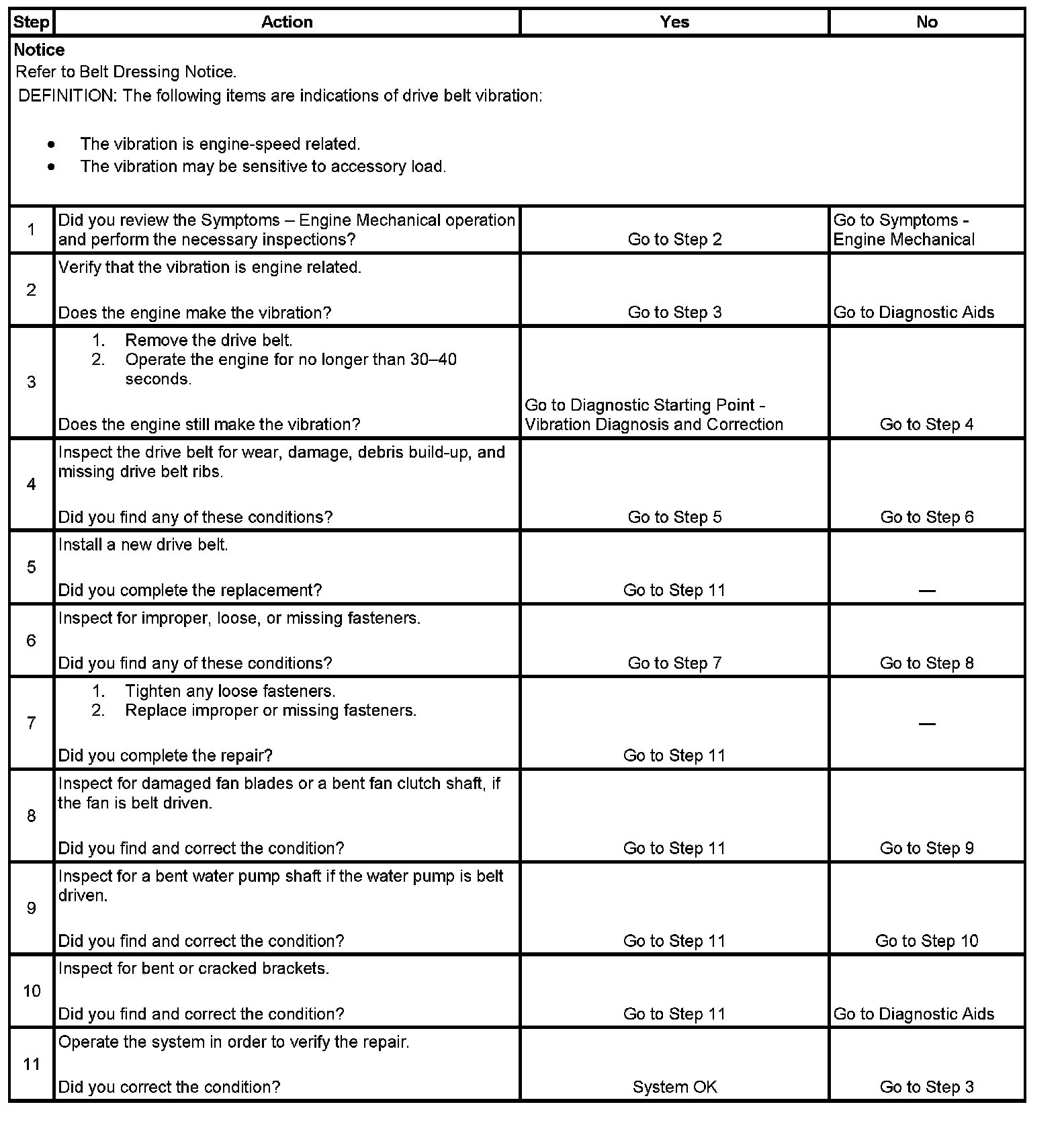 3. This test is to verify that the drive belt or accessory drive components may be causing the vibration. When removing the drive belt, the water pump may not be operating and the engine may overheat. Also DTCs may set when the engine is operating with the drive belt removed.