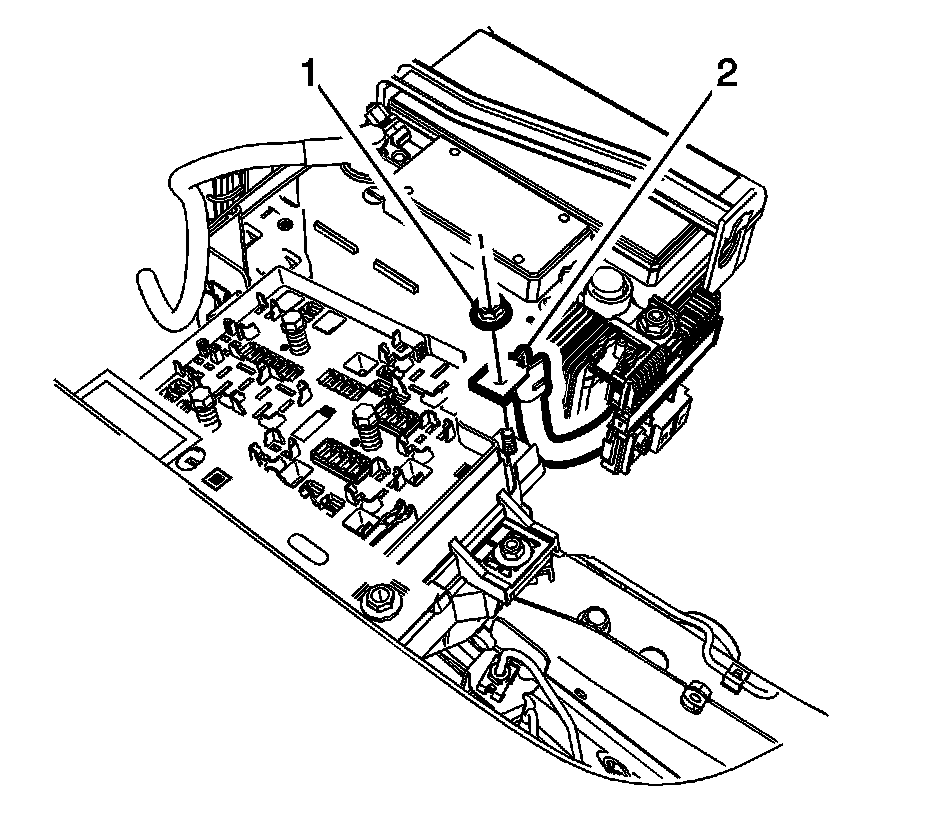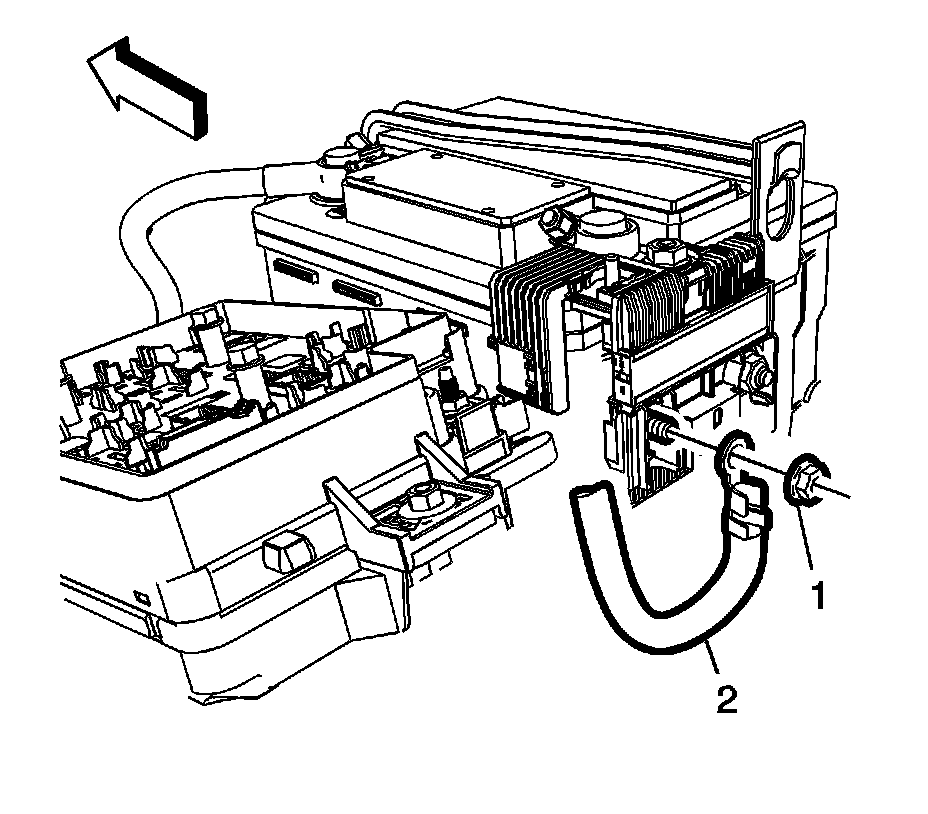 3. Remove the battery positive nut (1) and the battery positive cable (2), from the underhood fuse block.