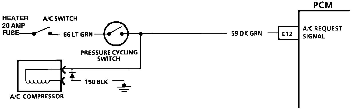 Turning "ON" the air conditioning supplies CKT 59 battery voltage to the A/C compressor clutch and to terminal "E12 of the control module connector to increase and maintain idle speed.