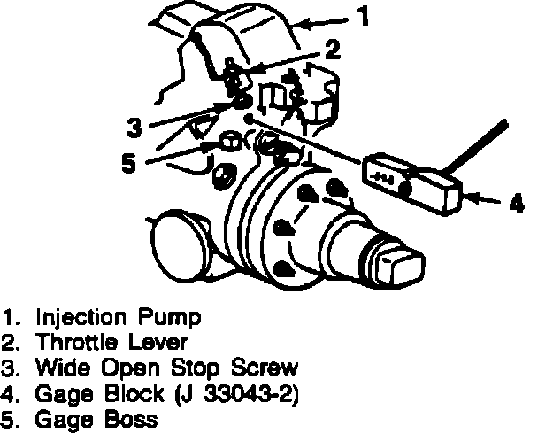 5. Insert the 0.646 side of the TP sensor/VRV gage block, (P/N J 33043-2), between the gage boss on the injector pump and the wide open stop screw on the throttle lever.