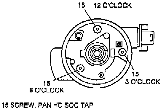 11. Screws (15). Tighten screw in 12 o'clock position first, screw in 8 o'clock position second, and screw in 3 o'clock position third.