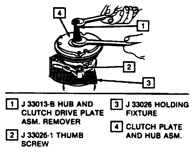 2. With center Screw forcing tip in place to thrust against the end of the shaft, thread the Clutch Plate and Hub Assembly Installer-Remover J 33013-B into the hub. Hold the body of the remover with a wrench and turn the center screw into the remover body to remove the clutch plate and hub assembly.