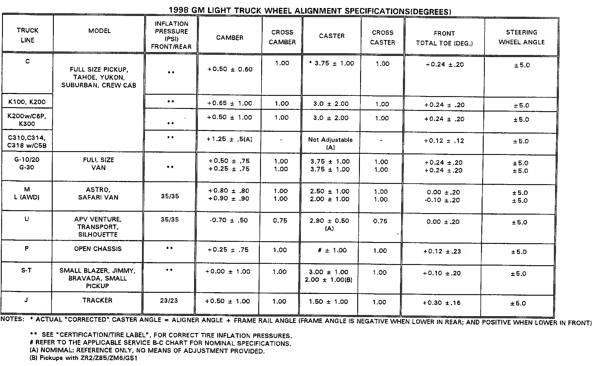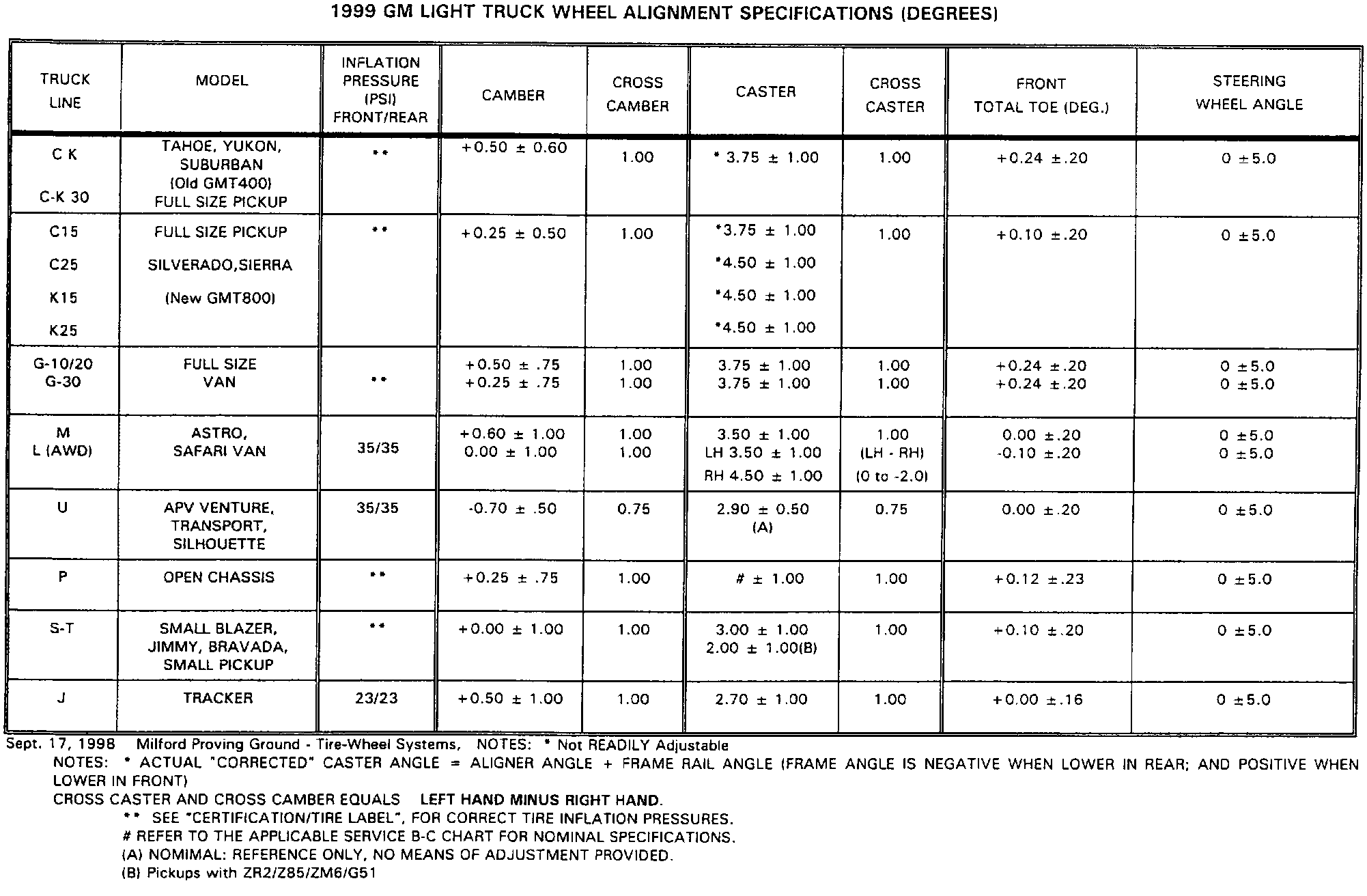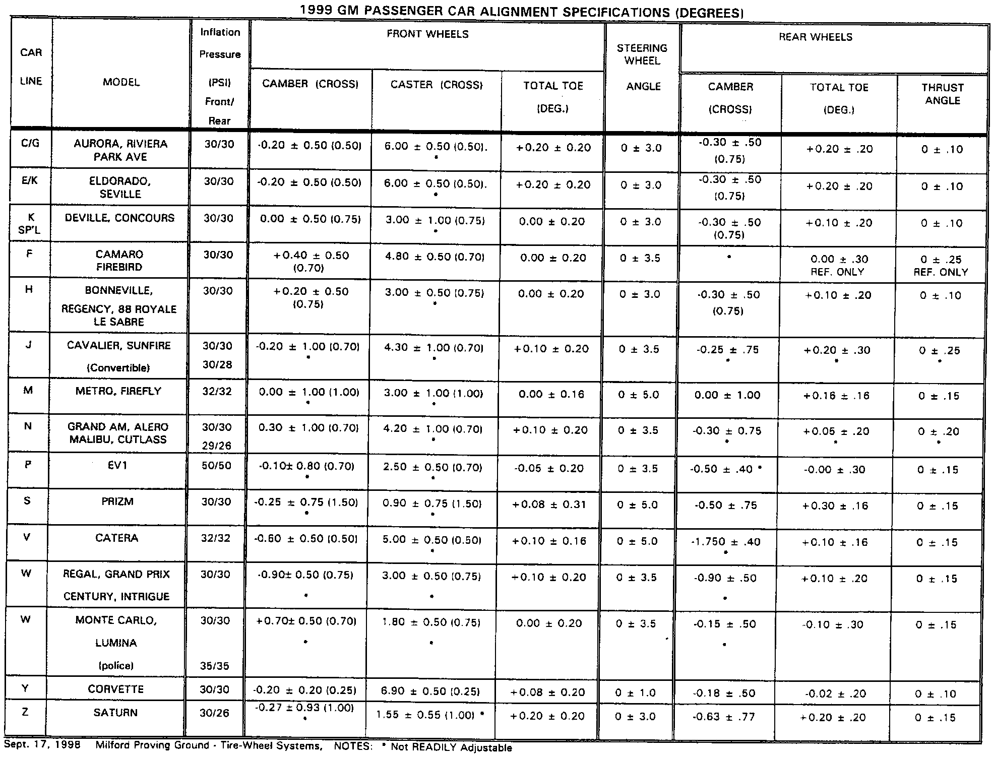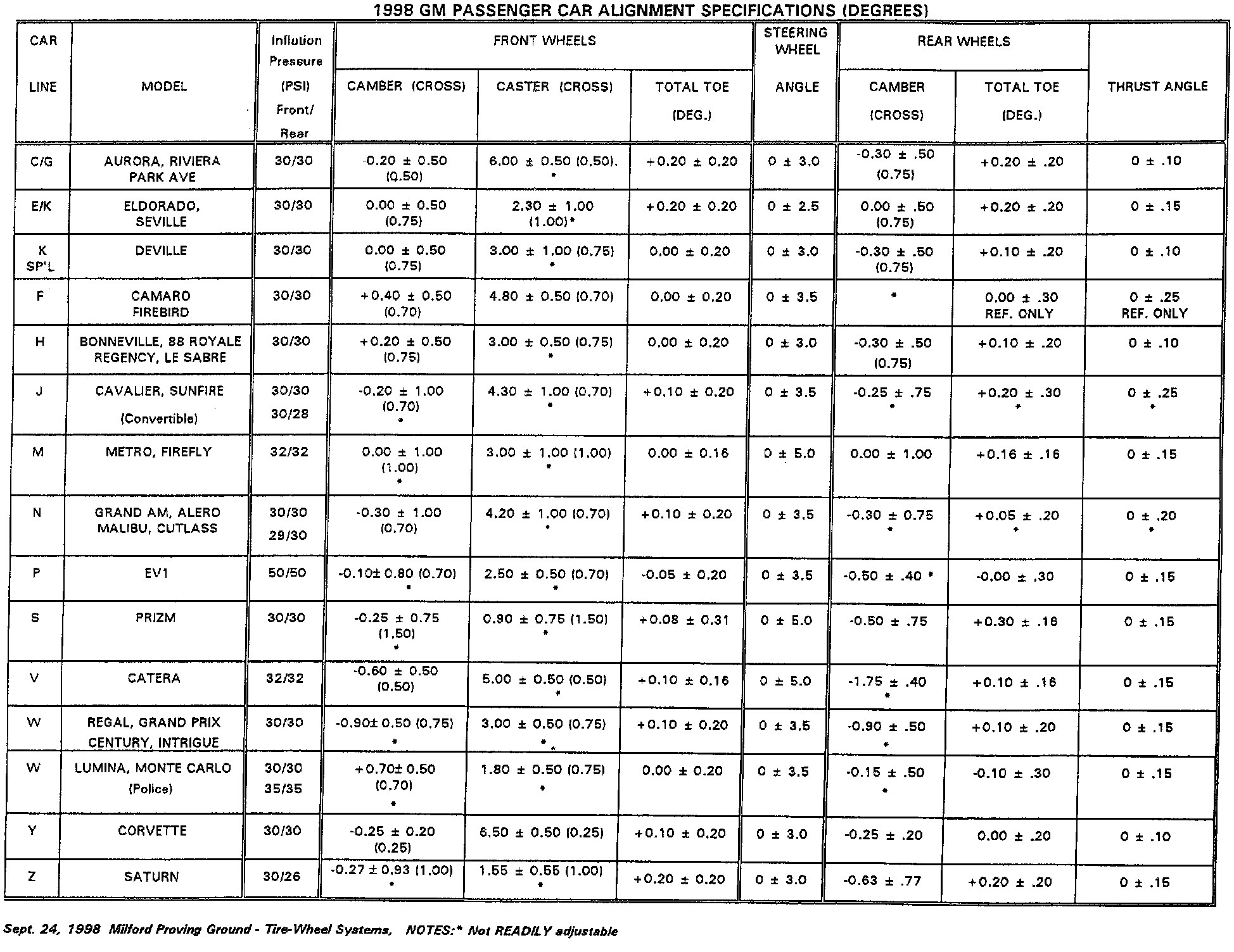This bulletin is being issued to communicate, in chart form, the final 1998 and the initial 1999 model year vehicle alignment specifications.