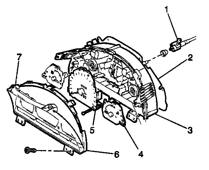 3. Remove the cluster lens (7) and bezel (6) assembly from the cluster housing (3) by releasing the 8 black plastic tabs.