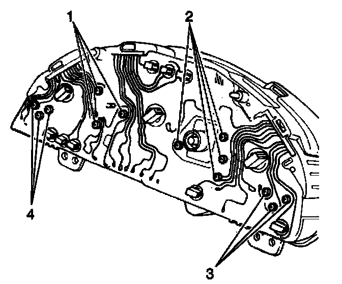 1. Install the speedometer gauge to the cluster housing. Secure the gauge with the 4 screws (2).