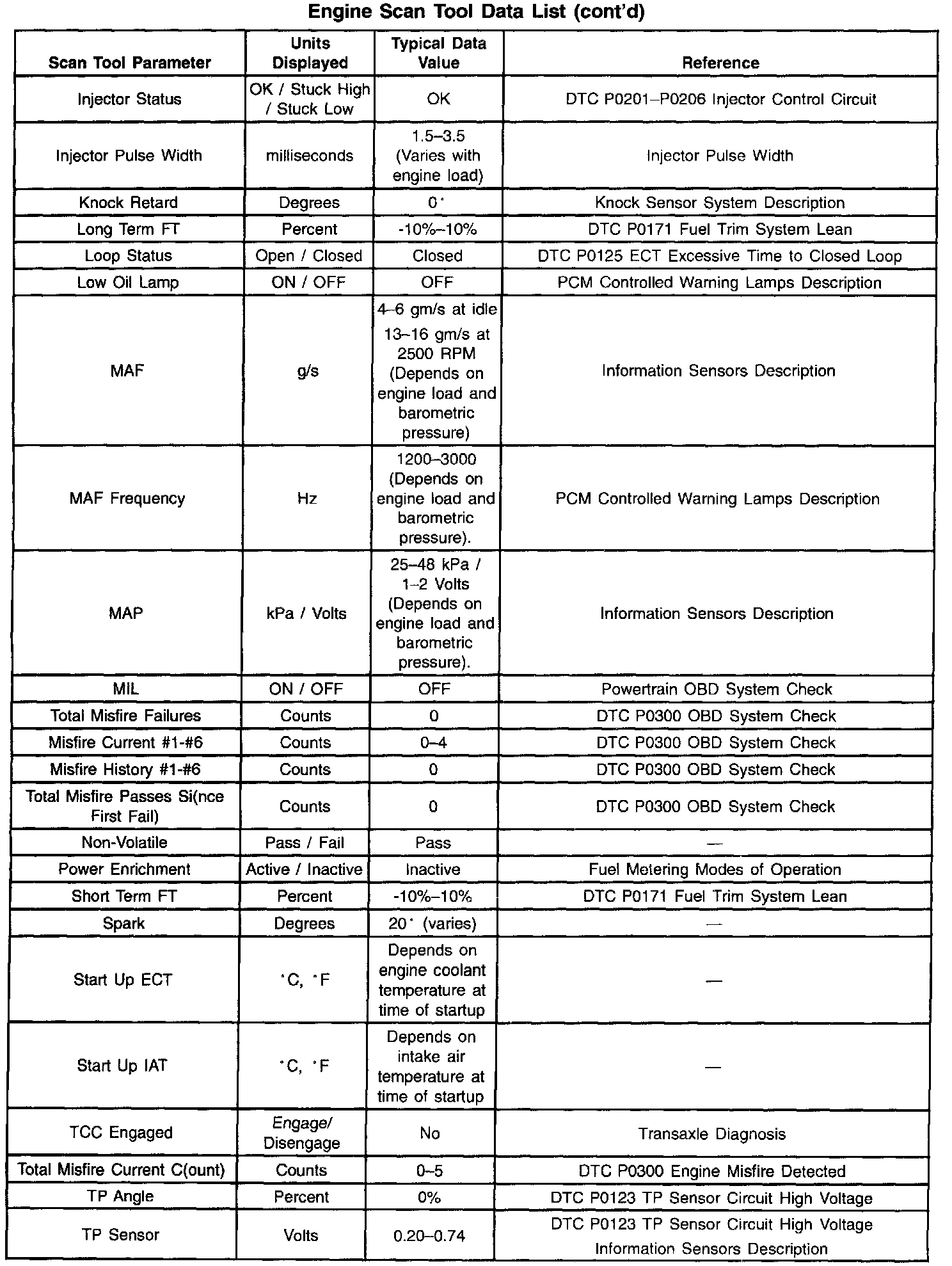 Use the scan tool data listed for comparison after the On-Board Diagnostic system check and finding the on-board diagnostics function properly with no diagnostic codes displayed. The Typical Scan Tool Data Values are an average of display values recorded from normally operating vehicles. The Typical Scan Tool Data Values are intended to represent what a normally functioning system would display. The values you get may vary due to a low battery charge or other reasons. But they should be very close.