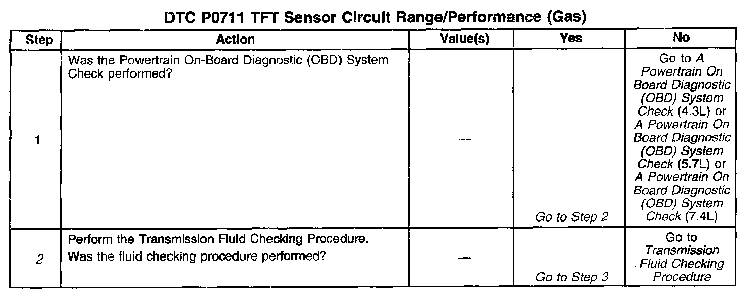 If the VCM detects the TFT sensor resistance has no change, or an unrealistic change in a short amount of time, (multiple changes within seconds) then DTC P0711 sets. DTC P0711 is a type D DTC.