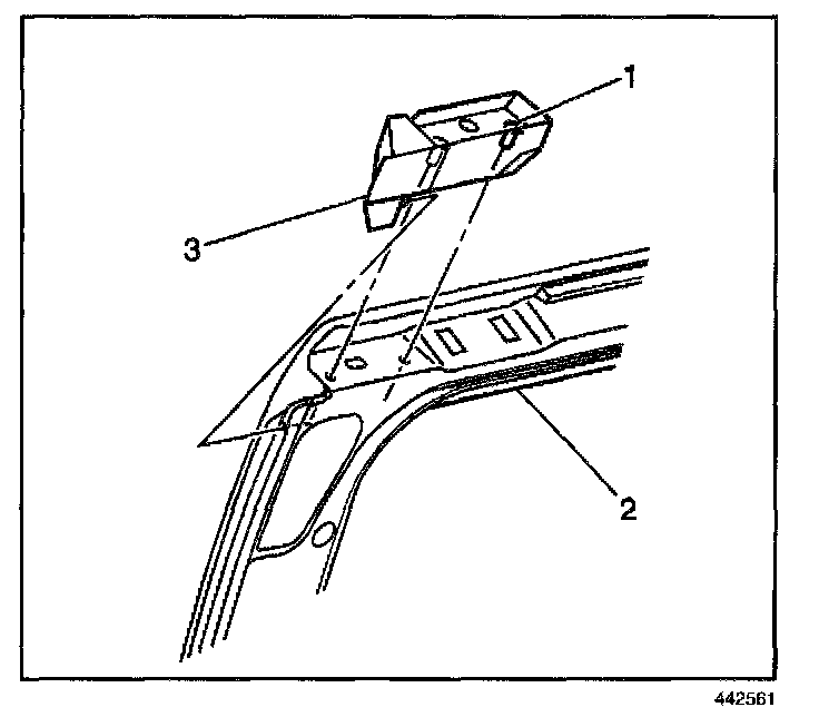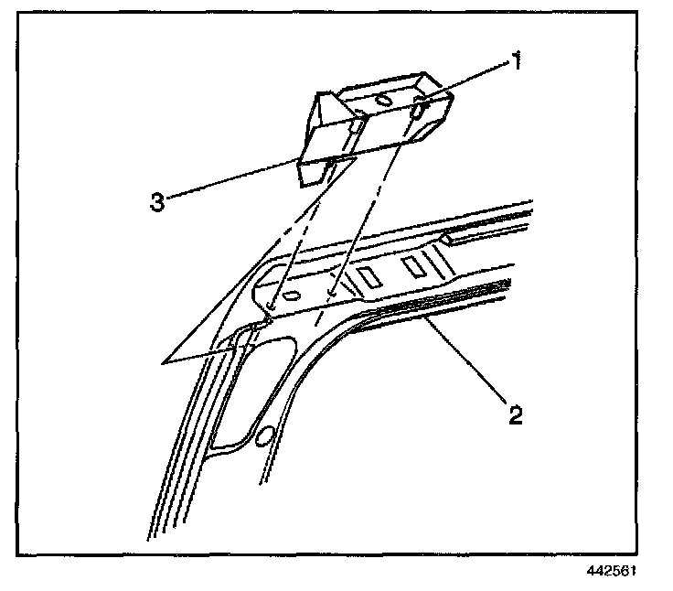 3. Locate the part by lining up the two pins (1) on the top of the weather-strip with the holes in the door sheet metal.