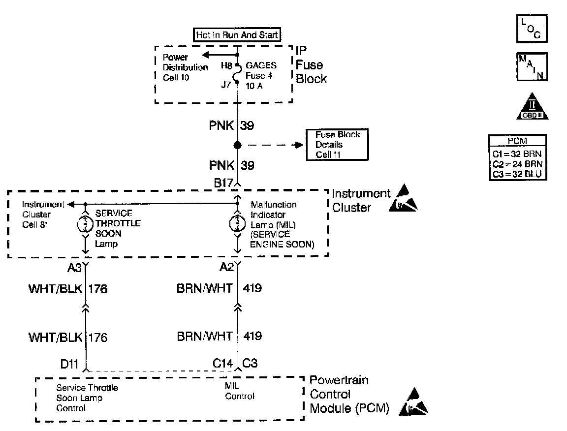 A dash light is illuminated by the Powertrain Control Module (PCM) if the diagnostics have detected certain errors related to the engine performance or the engine sensor status. When the PCM is commanding the Malfunction Indicator Lamp (MIL) ON, the voltage potential of the circuit will be low (near 0 volts). When the PCM is commanding the MIL OFF, the voltage potential of the circuit will be high (near the battery volts). The primary function to the PCM is to supply the ground for the MIL circuit.