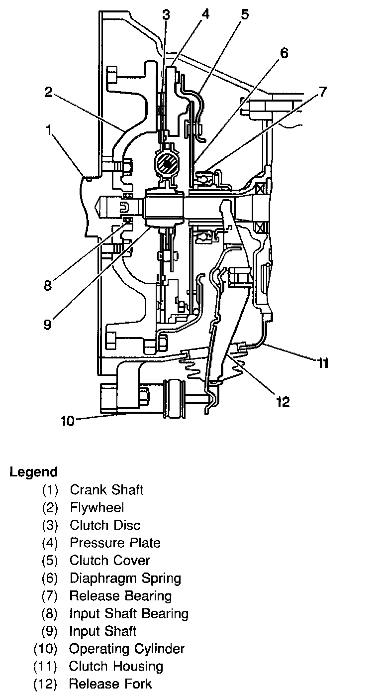 With the clutch pedal depressed, the clutch master cylinder becomes pressurized from the force of the push rod into the master cylinder. This forces hydraulic fluid into the hydraulic line to the actuator cylinder. The actuator cylinder then pushes the release fork (12) to engage the release bearing to advance and push on the tips of the tapered fingers of the diaphragm spring. When this happens, the diaphragm spring pulls the pressure plate away from the flywheel, thereby interrupting the flow of drive from the flywheel through the clutch disc to transmission input shaft.