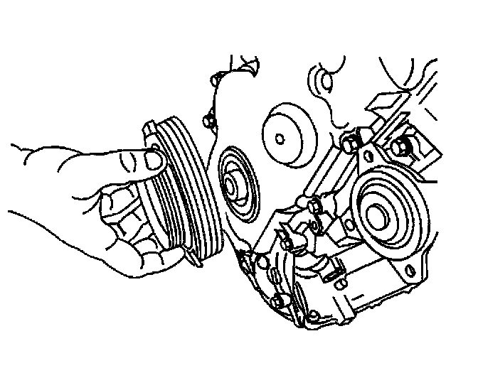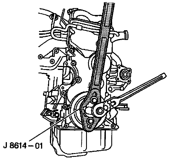 Remove the crankshaft pulley retaining bolt using the J8614-01 to prevent