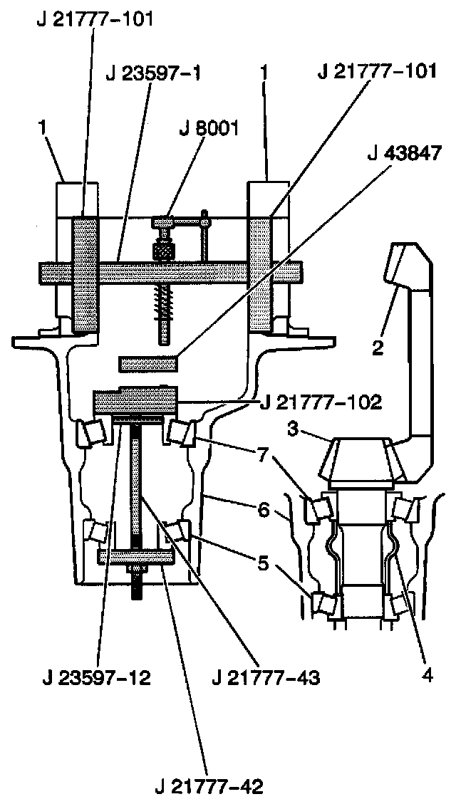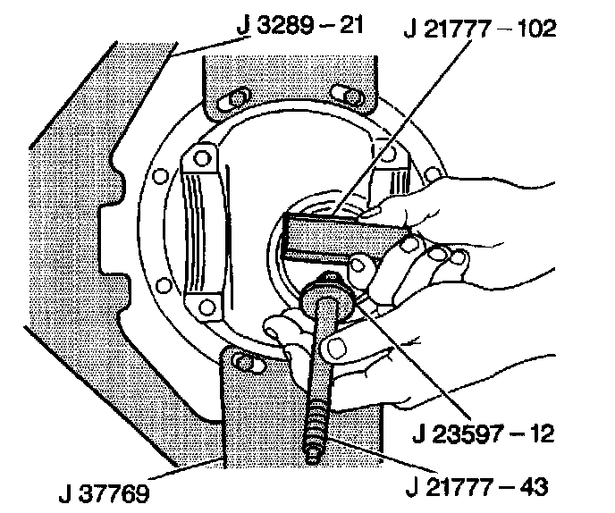 3. Place the inner pinion bearing into the differential carrier and install a J 21777-102 with the Differential Dummy attachment, a J23597-12, a J 21777-43 and a J 21777-42.