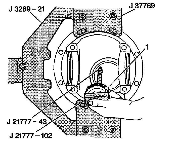 5. Rotate the J 21777-102 25 revolutions with the differential dummy attachment to ensure the pinion bearings are fully seated.
