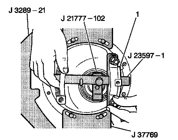 7. Install the J21777-101 in the side bearing bores with J23597-1 through both side bearing discs.