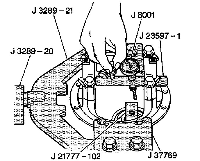 9. Install the dial indicator spring loaded plunger extension through the J23597-1 and position over the 97 mm level of the J 21777-102 with the differential dummy attachment.