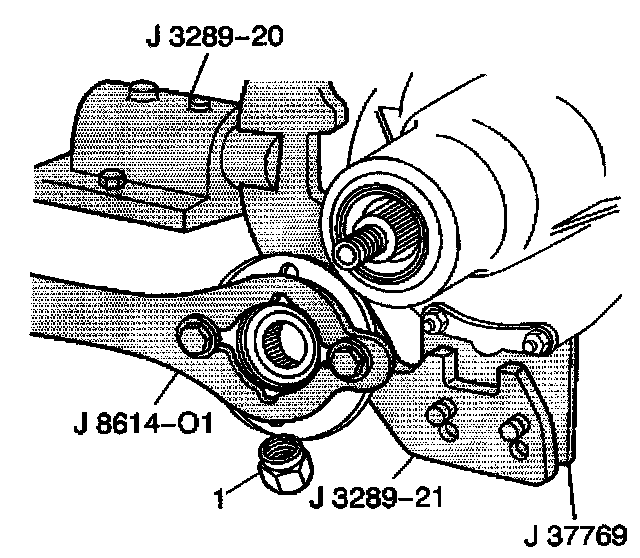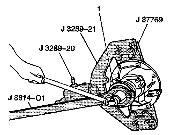 10. Remove the pinion flange nut (1) from the pinion gear using the J 8614-01 to hold the pinion flange stationary.