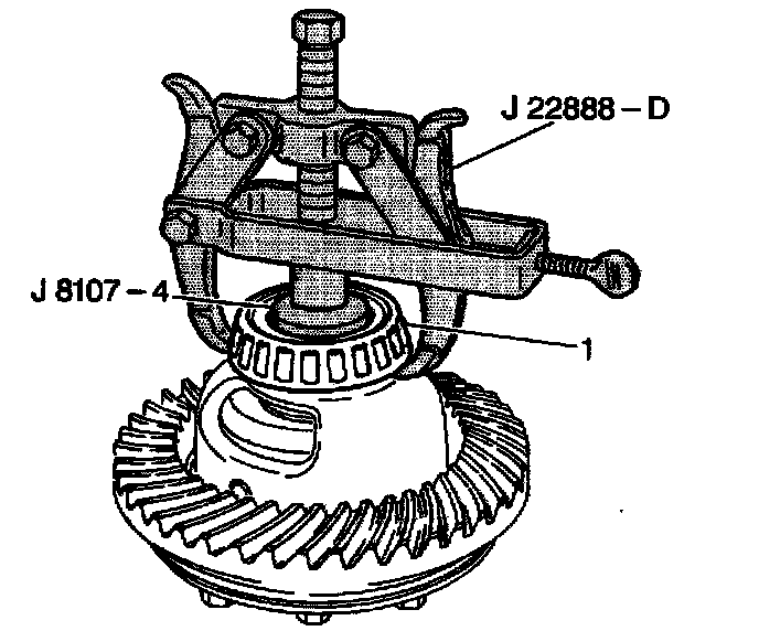16. Remove the side bearings (1) from the differential case using the J 22888-D with the J 8107-4.