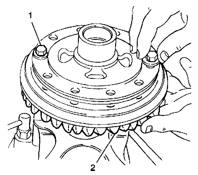 17. Remove the 10 bolts and the ring gear (1) from the differential case (2).