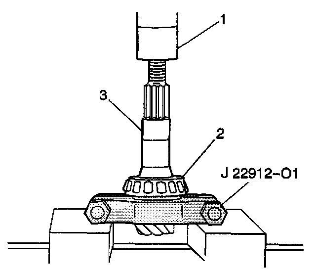 21. Remove the inner pinion bearing (2) and the collapsible spacer from the pinion gear shaft using the J 22912-01. Place the J 22912-01 on the pinion gear shaft with the concave side toward the pinion gear. Then place the pinion gear (3) in a hydraulic press (1) and remove the inner pinion bearing.