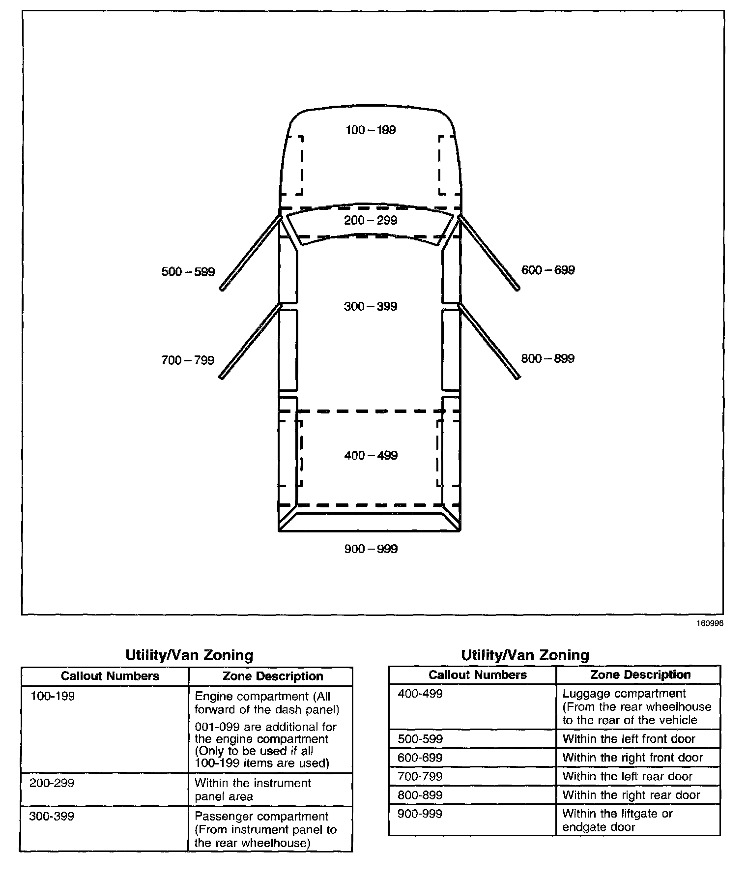 All grounds, in-line connectors, pass-through grommets, and splices have identifying numbers that correspond to where they are located in the vehicle. The following table explains the numbering system.