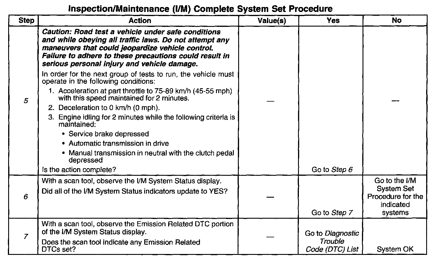 7. The I/M System Status only reports on whether or not a diagnostic has run, not what the outcome of the test was. If any emission related DTC sets after the tests are complete, the DTC will require diagnosis.