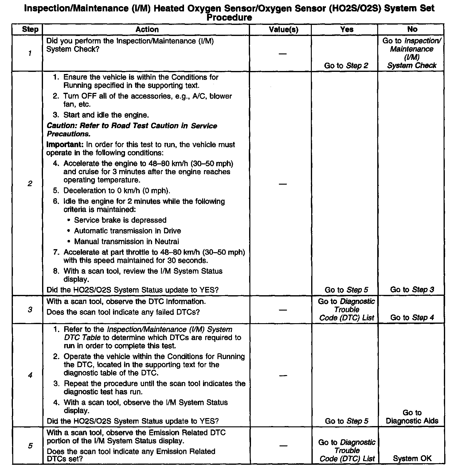 DESCRIPTIONThe purpose of this test is to satisfy the enable criteria necessary to execute I/M readiness diagnostics for the oxygen sensor (O2S, HO2S) system. The test may be used to set the I/M System Status to YES. Ensure the vehicle meets the requirements listed in Conditions for Running before performing this test. Failure to meet the necessary requirements may produce inaccurate test results.