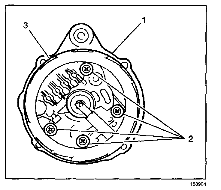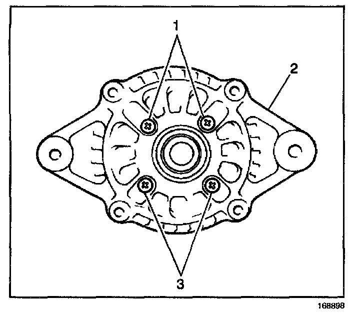 8. Install the stator to the rear housing. Secure the stator with the four retaining screws (2).