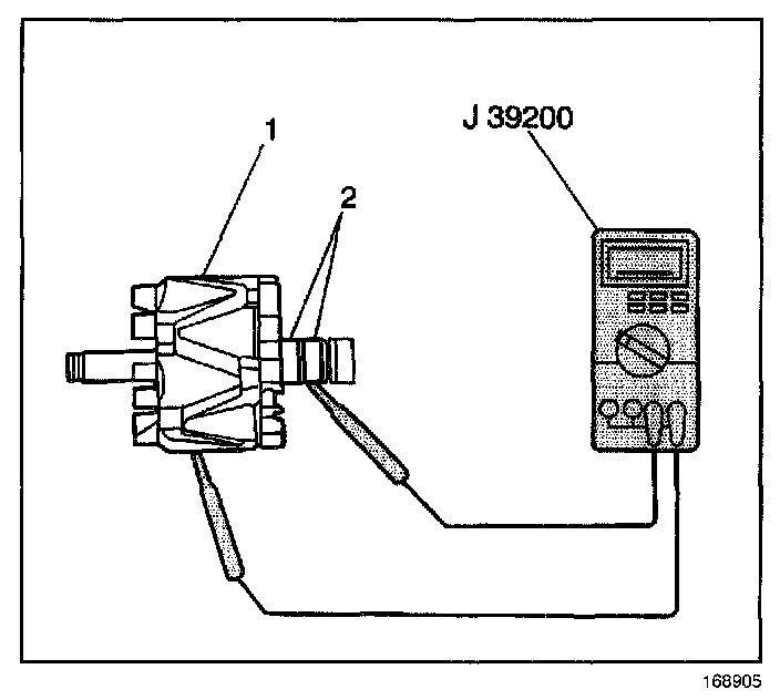 2. Measure the resistance between the rotor slip rings (2) and the rotor (1) using the J 39200. If the resistance is less than 5 ohms, replace the rotor.