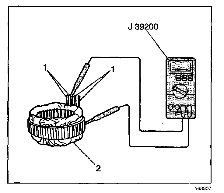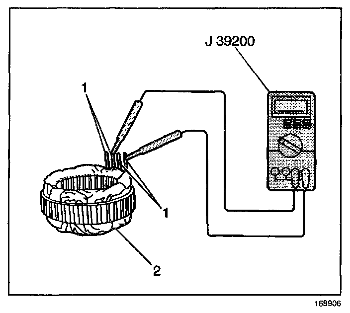 4. Measure the resistance between all stator leads (1) using J 39200. If the resistance is greater than 5 ohms for any measurement, replace the stator (2).