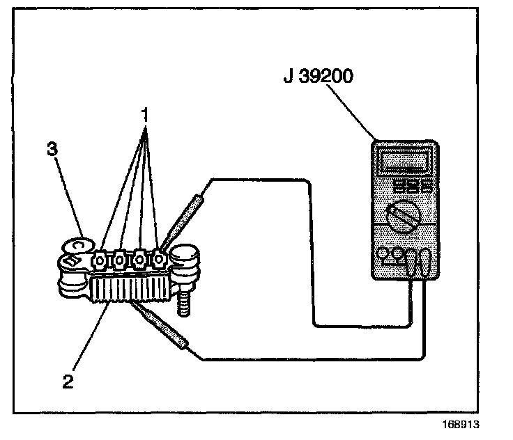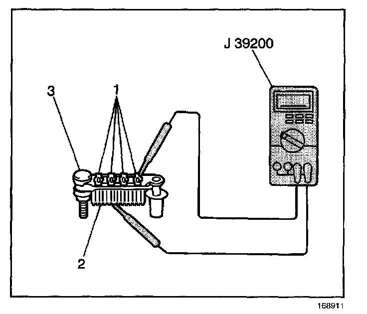 8. Measure the resistance between the rectifier lower body (2) and each diode lead (1) using the J 39200. Reverse the probes and measure the resistance again. The resistance should be less than 5 ohms in one measurement and greater than 5 ohms in the other measurement. If not, replace the rectifier.